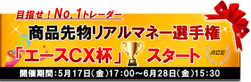 エース交易は、2013年5月17日から6月28日の期間で、エースCXオンラインに口座を持つユーザーが収益率を競う「商品先物リアルマネー選手権〜エースCX杯」を開催。全ユーザーの収益率を計算しランキング、最終上位者10名にギフト券をプレゼント。