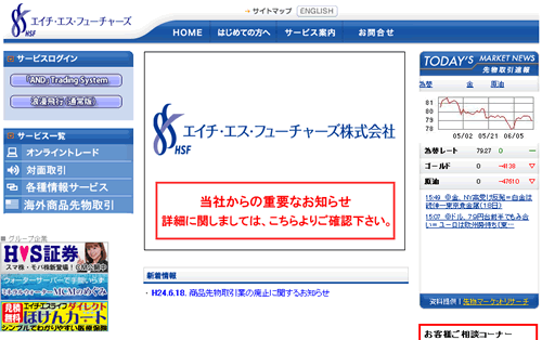 エイチ・エス・フューチャーズは、2012年6月18日開催の取締役会において、主たる業務である商品先物取引業を2012年9月11日をもって廃止する旨を決議。また、廃業に伴い、同社オンライントレード事業を日産センチュリー証券へへ譲渡することに関する基本合意書を締結する旨決議。
