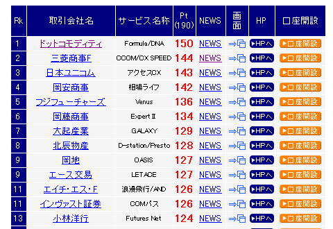 ▼商品先物ネット取引総合レーティング・ランキング(11/27現在)